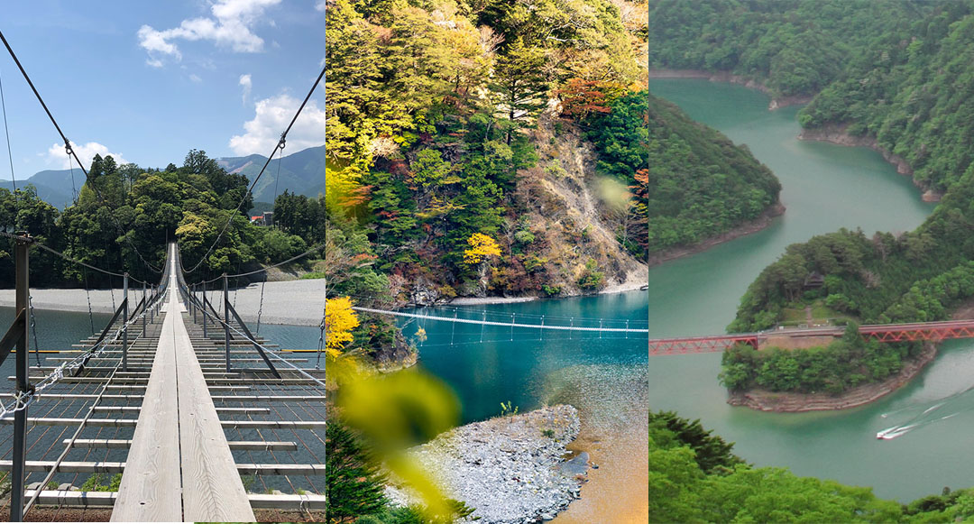初夏のまばゆい新緑とエメラルドグリーンの湖面とのマリッジ。晩秋の山肌を色鮮やかに染める渓谷美と凛とした静寂。そんな幻想的な自然を心ゆくまでご堪能ください。渡橋は一方通行で、渡った先は304段の急階段がありますので、足腰に自信のない方は渡らずに、ここで引き返えされるのも一考です。