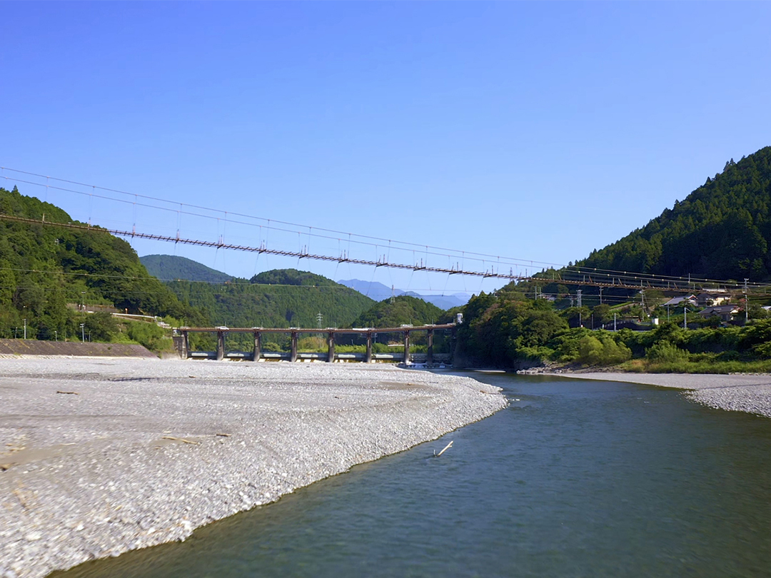 スリル満点!ゆらゆら揺れる吊り橋の上から大井川の景色を眺めてみよう!この吊り橋の全長は220m、大井川に架かる吊り橋の中で最長を誇ります。1931年に塩郷地区と久野脇地区を結ぶ生活道路として建設されました。山口百恵・三浦友和の二人が共演した、1978年公開の映画「炎の舞」のロケ地としても知られています。また、別称「恋鐘橋」とも呼ばれ、久野脇側にある恋の鐘を鳴らすと、恋愛が成就すると言われています。
