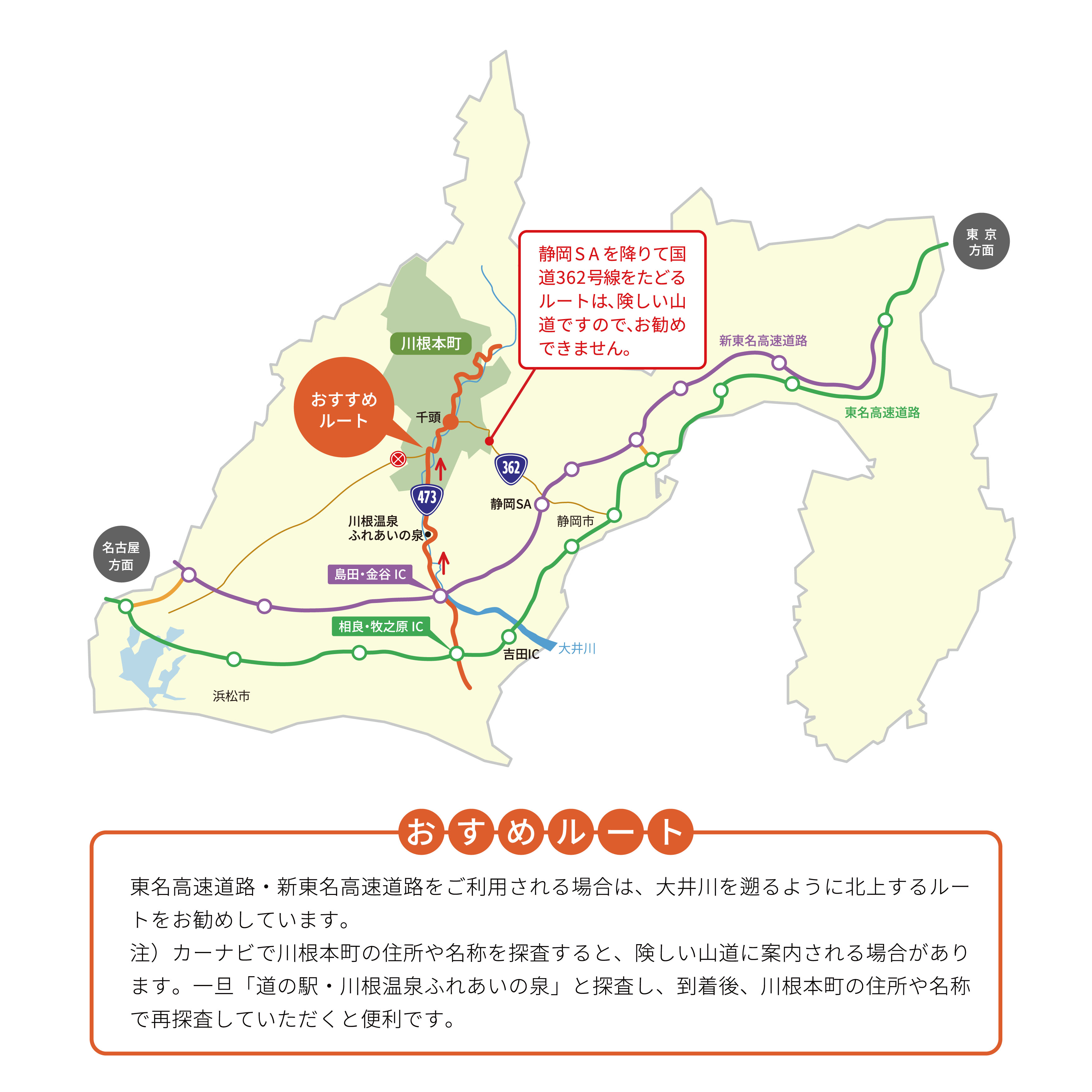 当観光協会としましては、新東名高速 島田金谷ICから大井川沿いに北上するルートをお勧めします。(ナビゲーションを使う場合は、3段階の目的地入力がわかりやすいです。①新東名高速 島田金谷IC ②道の駅川根温泉 ③目的地(夢のつり橋や奥大井湖上駅))